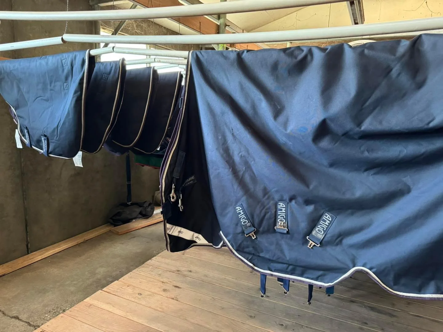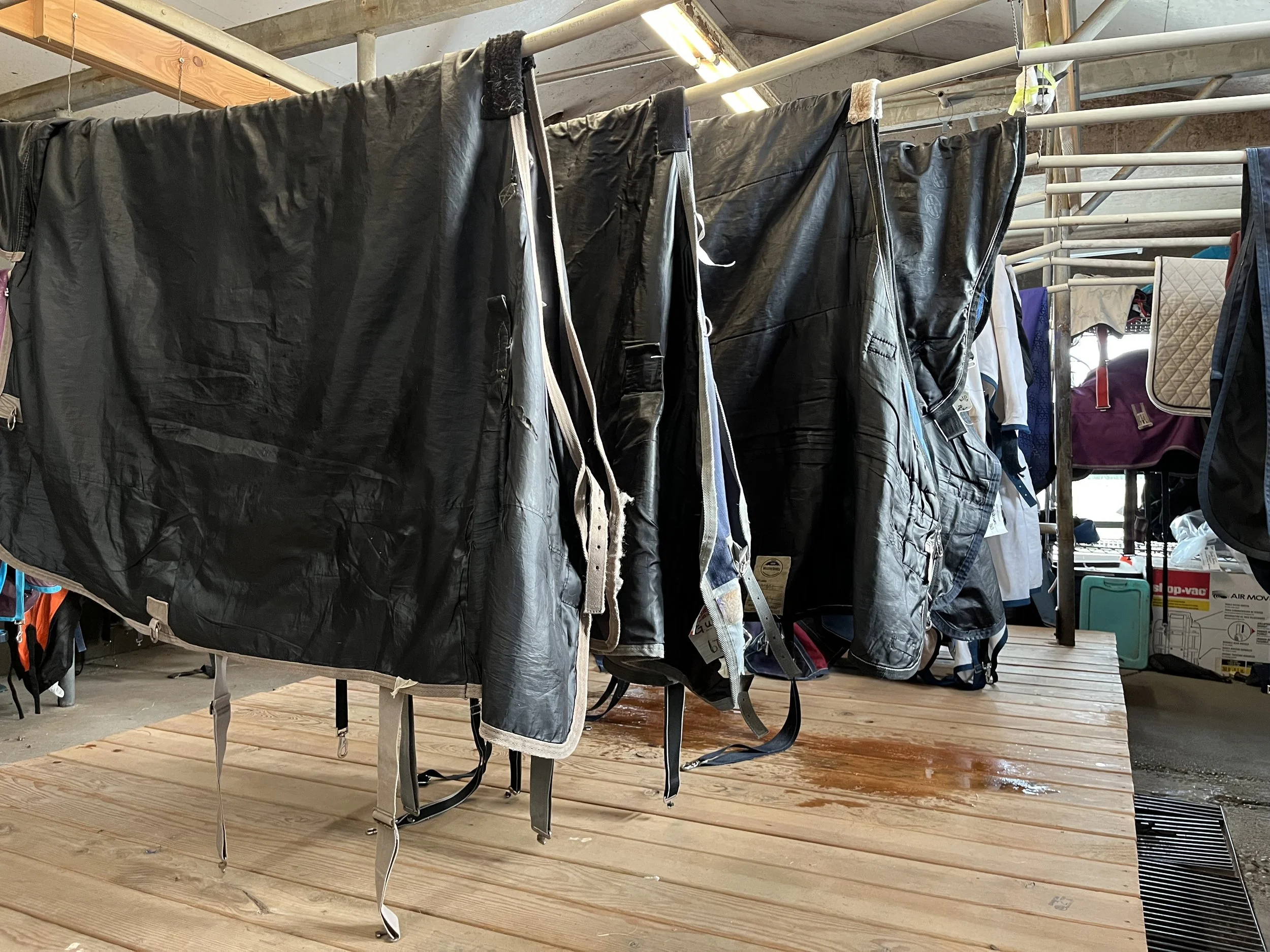 We wash all items in commercial washers, using Nikwax Rug Wash. This cleaner is gentle and specifically designed to clean as well as revitalize the breathability of equine blankets. We then air dry each item in our drying room with dehumidifiers, once your items are thoroughly dried we either complete any repairs specified, or bag them to maintain cleanliness until pick-up or drop-off.