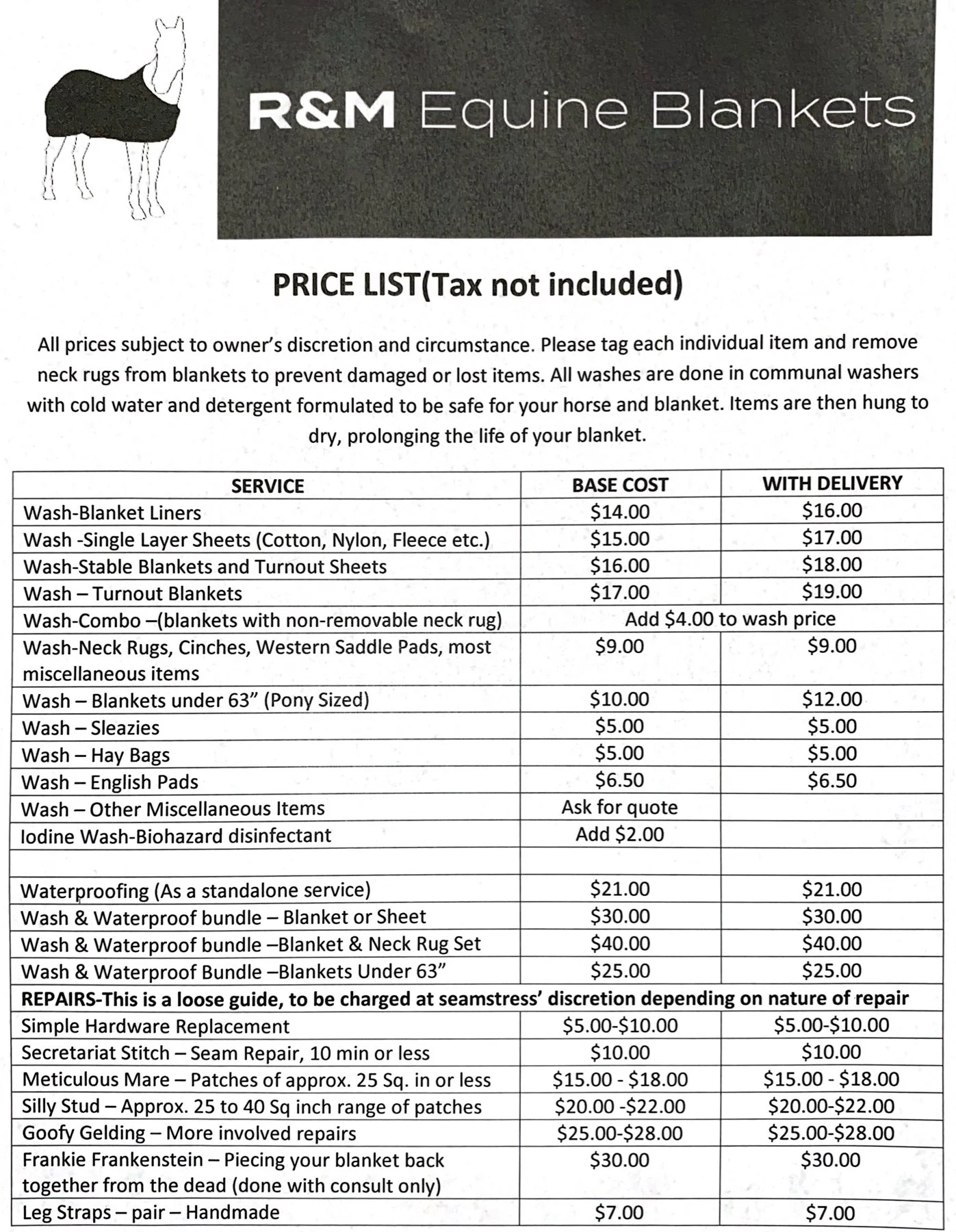 We offer laundering for equine blankets, sheets, neck rugs, sleazies, western and english saddle pads, hay bags, specialty therapeutic items such as Back on Track, and other miscellaneous items.